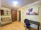 В прихожей расположен небольшой диван, шкаф, стол с компьютерным креслом.
